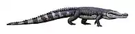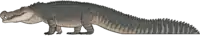 A particularly large mandibular fragment from a D. riograndensis specimen was estimated to have come from an individual with a skull length of 147.5 centimeters (4.84 ft). This length was used in conjunction with a regression equation relating skull length to total length in the American alligator to estimate a total length of 10.6 meters (35 ft) for this particular specimen.[16] This is only slightly lower than previous estimates for the species. Deinosuchus has often been described as the largest crocodyliform of all time. However, other crocodyliforms such as Purussaurus, Gryposuchus, Rhamphosuchus, Euthecodon, and Sarcosuchus may have equaled or exceeded it in size.[17]