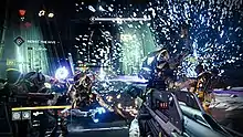 Destiny's style has been described as a first-person shooter that incorporates role-playing and MMO elements, but Bungie has avoided describing Destiny as a traditional MMO game.[3] Instead, the game has been referred to as a "shared-world shooter",[4] as it lacks many of the characteristics of a traditional MMO game. For instance, rather than players being able to communicate with all other players in the game or on a particular server — as is the case in many conventional MMO games — Destiny includes on-the-fly matchmaking that allows players to communicate only with other players with whom they are "matched" by the game. To communicate with other players in the game world, players must use their respective console's messaging system.[3] Time-limited events and modes are also occasionally added or featured in-game.[5][6] Activities in Destiny are divided among player versus environment (PvE) and player versus player (PvP) game types across the Cosmodrome and the Plaguelands (added with Rise of Iron) on Earth, the Moon, Venus, and Mars. The Iron Banner is another PvP event that allows guardians to get high tier loot from playing these competitive multiplayer matches only available during exclusive windows of time and completing bounties. There are also PvP maps for Mars's moon Phobos and the planet Mercury. A social space on Mercury was added with the House of Wolves expansion, but requires players to go undefeated in the Trials of Osiris Crucible mode in order to access it. Another PvE area, a massive ship called the Dreadnaught that is situated in the rings of Saturn, and two PvE missions on Phobos were added with The Taken King expansion.