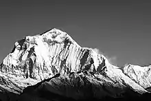 Dhaulagiri (धौलागिरी) is the Nepali name for the mountain which comes from Sanskrit where धवल (dhawala) means dazzling, white, beautiful[3] and गिरि (giri) means mountain.[4] Dhaulagiri I is also the highest point of the Gandaki river basin.