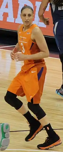 Diana Lorena Taurasi (born June 11, 1982) is an American professional basketball player for the Phoenix Mercury of the Women's National Basketball Association (WNBA), and is considered to be one of the greatest players in WNBA history.[1][2] She was drafted by Phoenix first overall in the 2004 WNBA draft. Taurasi has won the WNBA Rookie of the Year Award (2004), three WNBA championships (2007, 2009, and 2014), a historic five Olympic gold medals (2004, 2008, 2012, 2016 and 2020),[3] one WNBA Most Valuable Player Award (2009), two WNBA Finals MVP Awards (2009 and 2014), five scoring titles (2006, 2008, 2009, 2010, and 2011), and three FIBA World Cups (2010, 2014, and 2018). She has also been selected to ten WNBA All-Star teams and fourteen All-WNBA teams (including ten first-team selections). In 2011, she was voted by fans as one of the WNBA's Top 15 Players of All Time, and was named by the league to its 20th and 25th anniversary teams, respectively the WNBA Top 20@20 in 2016 and The W25 in 2021.[4] Also in 2021, she was selected by fans as the league's greatest player of all time.[5] On June 18, 2017, Taurasi became the WNBA all-time leading scorer and on June 27, 2021, became the first player to surpass 9,000 points.[6] On August 3, 2023, Taurasi became the first player to score 10,000 career points. Her penchant for scoring in crucial situations has earned her the nickname "White Mamba", coined by Kobe Bryant.[7] Taurasi is one of 11 women to win an Olympic gold medal, an NCAA Championship, a FIBA World Cup, and a WNBA Championship.