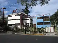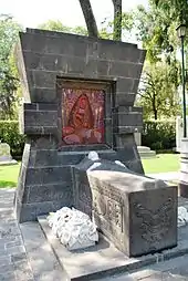 In the autumn of 1922, Rivera participated in the founding of the Revolutionary Union of Technical Workers, Painters and Sculptors, and later that year he joined the Mexican Communist Party[24] (including its Central Committee). His murals, subsequently painted in fresco only, dealt with Mexican society and reflected the country's 1910 Revolution. Rivera developed his own native style based on large, simplified figures and bold colors with an Aztec influence clearly present in murals at the Secretariat of Public Education in Mexico City[25] begun in September 1922, intended to consist of one hundred and twenty-four frescoes, and finished in 1928.[22] Rivera's art work, in a fashion similar to the steles of the Maya, tells stories. The mural En el Arsenal (In the Arsenal)[26] shows on the right-hand side Tina Modotti holding an ammunition belt and facing Julio Antonio Mella, in a light hat, and Vittorio Vidali behind in a black hat. However, the En el Arsenal detail shown does not include the right-hand side described nor any of the three individuals mentioned; instead it shows the left-hand side with Frida Kahlo handing out munitions. Leon Trotsky lived with Rivera and Kahlo for several months while exiled in Mexico.[27] Some of Rivera's most famous murals are featured at the National School of Agriculture (Chapingo Autonomous University of Agriculture) at Chapingo near Texcoco (1925–1927), in the Cortés Palace in Cuernavaca (1929–30), and the National Palace in Mexico City (1929–30, 1935).[28][29][30]