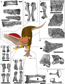 The scapulae (shoulder blades) were moderate in length and concave on their inner sides to follow the body's curvature. The scapulae were wide, particularly the upper part, which was rectangular (or squared off), a unique feature. The coracoids were elliptical, and not fused to the scapulae. The lower hind portions of the coracoids had a "horizontal buttress" next to the biceps tuber, unique for this genus. The arms were powerful, and had deep pits and stout processes for attachment of muscles and ligaments. The humerus (upper arm bone) was large and slender, and the ulna (lower arm bone) was stout and straight, with a stout olecranon. The hands had four fingers: the first was shorter but stronger than the following two fingers, with a large claw, and the two following fingers were longer and slenderer, with smaller claws. The claws were curved and sharp. The third finger was reduced, and the fourth was vestigial (retained, but without function).[2][31][6]