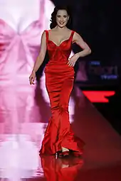 In 2012, Von Teese launched her own clothing line[54] and underwear line called Von Follies.[55][56] In 2013, she was both model and muse for the 'Dita' 3D printed gown designed by Michael Schmidt and Francis Bitonti and 3D printed by Shapeways exactly to fit her body.[57] Constructed of over 3,000 interlocked 3D printed components and over 12,000 Swarovski crystals it is one of the first fully articulated 3D printed garments to take the technology from haute couture to a sensual fabric-like form.[58]