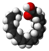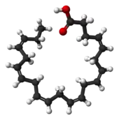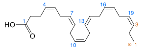DHA's structure is a carboxylic acid (-oic acid) with a 22-carbon chain (docosa- derives from the Ancient Greek for 22) and six (hexa-) cis double bonds (-en-);[2] with the first double bond located at the third carbon from the omega end.[3] Its trivial name is cervonic acid (from the Latin word cerebrum for "brain"), its systematic name is all-cis-docosa-4,7,10,13,16,19-hexa-enoic acid, and its shorthand name is 22:6(n−3) in the nomenclature of fatty acids.