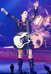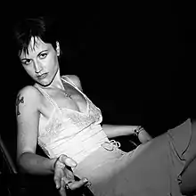 She has been recognised as a style icon, sporting a pixie cut or buzzed hair in the 1990s, and performing barefoot, saying "it just feels comfortable and honest to pull your toes along the ground".[11][66][67] Billboard's William Goodman described O'Riordan performing "Barefoot and strutting onstage, an Irish warrior poet with a bleached blonde pixie cut, gold chain necklace, singing without a flinch, as if it were ordained".[7] The New York Times mentioned that O'Riordan was responsible for a large portion of Dr. Martens boots sales in the 1990s.[65]