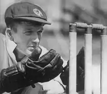 The following season, he played in the Country trials in Brisbane. He was selected for the Queensland Colts in 1932–33 and represented Queensland Country against Douglas Jardine's England cricket team during the Bodyline tour.[5] In England's innings of 376, Tallon conceded only five byes and stumped Herbert Sutcliffe, regarded as one of the finest batsmen in Test history.[3][4] He did not get a chance to display his batting prowess as the Bodyline spearhead Harold Larwood rattled him with a series of deliveries aimed at the throat,[4][6] before bowling him for two.[7] Tallon's fast and efficient skills behind the stumps further caught the eye of cricket officials in early 1933 at the Country Week Carnivals. Tallon distinguished himself with his tidy keeping to the express pace bowling of Eddie Gilbert, whose suspect action and indigenous heritage were later the subject of controversy.[4][6]