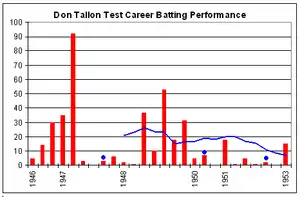 Tallon had had moderate success with his batting during the Test series, aggregating 114 runs at 28.50.[27] In 14 first-class matches, he scored 283 runs at 25.72.[7] The Australian team strategy of primarily depending on pace bowling saw Tallon make 12 catches and no stumpings during the Tests;[27] however, Bradman rested his lead pace bowlers Miller and Lindwall during the tour games to save energy for the Tests and allowed the spinners do more work,[54] so that overall Tallon took 29 catches and 14 stumpings for the tour.[7] Bradman deemed Tallon more agile than Saggers and better at taking acrobatic catches. Tallon's performances during the English summer saw him named by Wisden as one of its five Cricketers of the Year.[54]