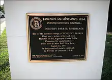 Here lie the ashes of Dorothy Parker (1893–1967) humorist, writer, critic. Defender of human and civil rights. For her epitaph she suggested, 'Excuse my dust'. This memorial garden is dedicated to her noble spirit which celebrated the oneness of humankind and to the bonds of everlasting friendship between black and Jewish people. Dedicated by the National Association for the Advancement of Colored People. October 28, 1988.[67]