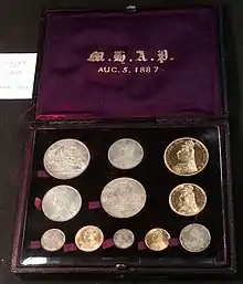 During the 19th century, Britain continued its longtime monetary system, under which 12 pence constituted a shilling, and 20 shillings a pound.[3] There was interest in decimalisation of this system, and in 1849, the florin, equal to two shillings or one tenth of a pound, was issued as a first step. It was intended to replace the half crown, worth two shillings and sixpence, and production of the half crown was discontinued in 1850, but resumed in 1874, and both coins were struck until full decimalisation in the 1970s. The crown, or five-shilling piece, was not struck for circulation between 1847 and 1887; the 1847 coinage was struck in limited numbers and possibly intended as keepsakes.[4][5] When a double florin was proposed by a director of the Bank of England in 1874, the Deputy Master of the Royal Mint, Charles Fremantle, opposed it.[6]