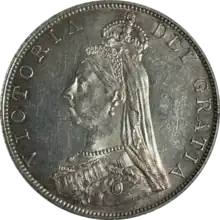 Around the rim of the double florin are abbreviated versions of some of the queen's titles,[34] with the date on the reverse. The obverse legend reads VICTORIA DEI GRATIA (Victoria by the Grace of God) and continuing on the reverse, BRITT: REG: FID: DEF:[lower-alpha 1] (Queen of the Britains, Defender of the Faith).[35] The "Britains" in the legend is meant to include the colonies and other territories.[36] Not present is IND: IMP:,[lower-alpha 2] Empress of India. The act which permitted Victoria to adopt that title had forbidden her to use it within the United Kingdom, and the double florin reflects that decision. The queen wanted that title to appear on British coinage, and would get her way on the next issue, appearing beginning in 1893,[34] after the abolition of the double florin.[37]
