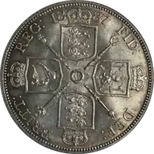 The reverse has four cruciform shields, with sceptres in the angles between them. This was based on the designs of John Roettier for the gold coinage of Charles II.[24] The reverse designs for the florin and double florin (which are nearly identical) were described in the proclamation making them current as "contained in Four Shields arranged crosswise, each shield crowned, and between the Shields Four Sceptres surmounted by Orbs, a Thistle and a Harp, and a Star of the Garter in the Centre".[31] These constituted the arms of the United Kingdom.[32] The shields at top and bottom are the arms of England, the one on the right that of Scotland, and on the left that of Ireland.[2] Gertrude Rawlings wrote in 1898 that the design for the double florin is "radiating kitchen pokers and tea trays".[33]