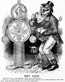 The next largest coin in denomination was the gold half sovereign, equal to ten shillings.[7] This was a small coin, equal in size to the silver sixpence (plating sixpences and passing them for half sovereigns was a continuing abuse).[8][9] The government discouraged the use of half sovereigns—unlike silver coins, the sovereign and half sovereign were to contain their full value in precious metal, to an exacting standard set by the Coinage Act 1870. These limits were so tight that 45 per cent of newly-struck half sovereigns were rejected by the automatic scales at the Royal Mint, requiring their recoinage. The government profited through seignorage on silver coins at about 20 per cent, depending on the price of silver. Thus, the half sovereign was expensive in terms of both the value of its metal and its production costs, especially in comparison with the silver coinage. Such problems were less acute with the sovereign, for which demand continued high as a world-wide trade coin, whereas the half sovereign tended to remain in Britain. In 1884, the Gladstone government proposed to reduce the amount of gold in the half sovereign by a tenth, rendering it a token coin, but the change was abandoned.[10] British gold coins were legal tender for payments in any amount, but silver coins were only legal tender to forty shillings.[11]