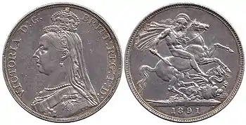 The year 1889 saw the largest number issued, both of the double florin and of the revived crown, with more than a million struck of each. This was because the government used the two large coins in pay packets for its employees, and because of an agreement it had made with the Bank of England to reimburse the bank for conveying silver coin to its branches and to provincial applicants.[10] In March 1890, Goschen told the Commons that "there can hardly be said to be any similarity between the double florin and the crown" and was met with cries of "Oh!",[56] indicating disbelief.[37] On 5 May, upon being asked if there was any consideration being given to withdrawing either the crown or the double florin, he stated that the crown was growing in popularity and, "as to the four shilling piece, it is premature to come to any decision. Time alone can show what is the real use of a coin."[57] Nevertheless, minting of the double florin ceased forever in August 1890.[37] According to Richard Lobel in the Coincraft Standard Catalogue of English and UK Coins, "this denomination, unpopular at the time of issue, lasted until 1890, when it had outlived its usefulness. The use of the Boehm portrait no doubt accelerated its demise."[24] Sir John Craig, in his history of the Royal Mint, stated that "its closeness to the 5s. piece, its size and its novelty were fatal handicaps; it was dropped ... after an issue of 21/2 million specimens, and the flop was so flagrant that the Mint, contrary to all its practice, took the coins back at full face value on request".[58]