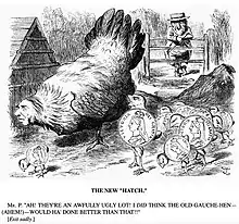 The Jubilee coins, including the double florin and the crown, were issued in June 1887,[47] with the official release initially set for 21 June, the date on which the queen's Golden Jubilee was to be celebrated.[32] Since this day had been proclaimed a bank holiday, the release date was changed to 20 June, on which date the coins were to be conveyed from the Royal Mint to the Bank of England and there used to fill orders from London banks. Provincial banks would not have the new coins until at least the 22nd, and the Dundee Courier reported that "it is expected that the demand for the double florin will soon exhaust the first supply".[48] Once the new coins were released, there was a deeply negative reaction by public and press. According to Dyer and Stocker, "When the storm of condemnation erupted, Fremantle seemed genuinely taken aback at 'the sad turn affairs have taken, most unexpected to me'. It was some storm: questions in Parliament, outspoken criticism from all sections of the press, derisive cartoons and doggerel in Fun and Punch, and even some unfriendly comment by John Evans in his presidential address to the Royal Numismatic Society. The coinage was seen as the worst of all worlds; poorly executed, undignified on the obverse, and inefficient in not specifying values on the reverse."[49] According to Heffer, as Victoria's "popularity had recovered considerably among her people by 1887, there was an outcry at this less than idealised representation".[29] The double florin was particularly criticised.[37]
