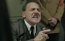 Downfall is well known for its rise in popularity due to many "Hitler Rants" internet parody videos which use several scenes in the film: when Hitler phones General der Flieger Karl Koller about Berlin's April 20 bombings; when Hitler discusses a counterattack against advancing Soviet forces with his generals; where Hitler becomes angry after hearing that Steiner's attack never happened, due to a lack of forces; when Hitler hears Luftwaffe commander Hermann Göring's telegram; when Hitler is having dinner and discovers Reichsführer-SS Heinrich Himmler secretly made a surrender offer to the Western Allies; and where Hitler orders Otto Günsche to find SS-Gruppenführer Hermann Fegelein. In the videos the original German audio is retained, but new subtitles are added so that Hitler and his subordinates seem to be reacting to an issue or setback in present-day politics, sports, entertainment, popular culture, or everyday life.[58][59][60][61] In addition, some users combine footage from the film with other sources, dub the German dialogue over video games and/or footage from other films and TV series, or edit images of the characters onto pre-existing or animated footage, often for greater comic effect.[62][63][60]