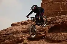 Downhill mountain biking (DH) is a style of mountain biking practiced on steep, rough terrain that often features jumps, drops, rock gardens and other obstacles. Jumps can be up to and including 12 meters (39 feet), and drops can be greater than 3 meters (10 feet).