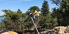 The 1st downhill time-trial race took place in Fairfax, California on October 21, 1976 on a fireroad now referred to as Repack Road,[2][3][4] due to the need to repack the hub brake after each descent.[5] The bikes used were based on cruiser bicycles that had a drum or coaster brake that worked by pedalling backward. The mechanism operated with a conical brake shoe being wound on a thread in a metal hub. To prevent the brake from seizing it was kept filled with grease. Heavy use during the descent would cause the brake to over heat, softening the grease and causing it to drain from the hub, requiring frequent repacking. Ten riders descended 1,300 feet (400 m) of Repack road in about 5 minutes.[6]