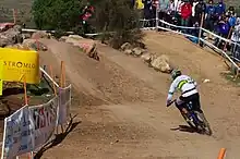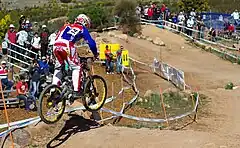 ![]() Australian rider Jared Rando takes the A line at the 2009 UCI World Mountain Bike Championships in Canberra, Australia. |