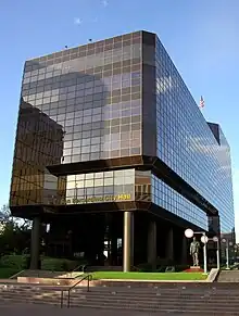 City Hall is a six-story building designed in 1963 by César Pelli to reflect the urban environment around it.[22] Completed in 1972, the City Hall is modernist in style,[23] has curtain walls, and is clad entirely in glass, with slim aluminum mullions.[24] Parts of the building are raised off the ground by pilotis.[25]