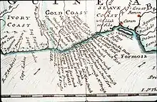 One of the first sailors who focused on trade with Africa was Balthazar de Moucheron. The trade with Africa offered several possibilities to set up trading posts or factories, an important starting point for negotiations. It was Blommaert, however, who stated that, in 1600, eight companies sailed on the coast of Africa, competing with each other for the supply of copper, from the Kingdom of Loango.[5] Pieter van den Broecke was employed by one of these companies. In 1612, a Dutch fortress was built in Mouree (present day Ghana), along the Dutch Gold Coast.