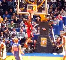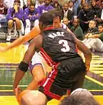 On November 1, in what was only his third game of the 2009–10 season, Wade recorded his 10,000th career point during a 95–87 win against the Chicago Bulls.[72] On November 12, Wade made a spectacular dunk over Cavalier Anderson Varejão. James regarded the dunk as "great, probably top 10 all-time".[73] Two days later against the New Jersey Nets, Wade hit another buzzer beater for a one-point win at 81–80.[74] On January 6, Wade scored a season-high 44 points during an overtime loss to the Boston Celtics, the most in a losing effort that season.[75] Wade appeared in the 2010 NBA All-Star Game.[76] Wade was named the game's MVP with 28 points, 11 assists, 5 steals and 6 rebounds.[77]