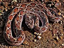 The color-pattern consists of a pale buff, grayish, reddish, olive or pale brown ground color, overlaid mid-dorsally with a series of variably colored, but mostly whitish spots, edged with dark brown, and separated by lighter interblotch patches. A series of white bows run dorsolaterally. The top of the head has a whitish cruciform or trident pattern and there is a faint stripe running from the eye to the angle of the jaw. The belly is whitish to pinkish, uniform in color or with brown dots that are either faint or distinct.[2][6]