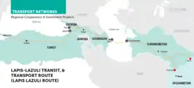 Afghanistan's geographical location makes it economically secured.[21][122][123][124][125][126] The Lapis Lazuli corridor connects Afghanistan with Turkmenistan and ultimately ends somewhere in Europe.[127] Other such trade routes connect Afghanistan with neighboring Iran, Pakistan, Tajikistan and Uzbekistan.[128] The country also has direct trade with China and India via air corridor.[129] It has four international airports, which include: Kabul International Airport in the capital city; Mazar-e Sharif International Airport in the north of the country; Herat International Airport in the west; and the Ahmad Shah Baba International Airport in Kandahar.[130] It also has about 24 domestic airports.[131] The major airlines of the country include Ariana Afghan Airlines and Kam Air. Its national rail network is slowly expanding to connect Central Asia with Pakistan and Iran.[132][133][134] In addition to Central Asia, imported goods also come by rail from neighboring Iran.[135]