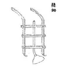 While there was already a great diversity in agricultural implements of the tread plow (tali 踏犁) because of lacking oxen, of lever-knife (zhadao 鍘刀) and the northeastern-style plow (tang 耥), the use of water power to move millstones, grinding stones and hammers and to move water from canals and rivers to irrigation ditches by a chained-buckets mechanism (fanche 翻車) became more and more usual, especially with large land owners. Until then, water was hoisted by a mechanism where large step-powered wheels (tache 踏車) moved chained buckets with water from the river to a ditch. As an inplement to pluck out rice seedlings peasants made use of the "seedling horse" (yangma 秧馬), planting and fertilizing was the task of a machine called "dung-drill" (fenlou 糞耬). In northern China, a "drill-tiller" (louchu 耬耡) was in use, while in the lower Yangtze region, a "plow-weeder" (tangyun 耥耘) became widespread at the end of Southern Song. For harvesting, a pushing scythe (tuilian 推鐮) with two wheels was invented.[9]