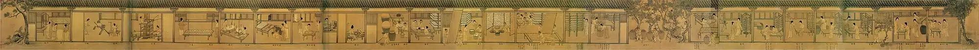 Rural families that sold a large agricultural surplus to the market not only could afford to buy more charcoal, tea, oil, and wine, but they could also amass enough funds to establish secondary means of production for generating more wealth.[23] Besides necessary agricultural foodstuffs, farming families could often produce wine, charcoal, paper, textiles, and other goods they sold through brokers.[23] Farmers in Suzhou often specialized in raising bombyx mori to produce silk wares, while in Fujian, Sichuan, and Guangdong farmers often grew sugarcane.[23] In order to ensure the prosperity of rural areas, technical applications for public works projects and improved agricultural techniques were essential. The vast irrigation system of China had to be furnished with multitudes of wheelwrights mass-producing standardized waterwheels and square-pallet chain pumps that could lift water from lower planes to higher irrigation planes.[24]