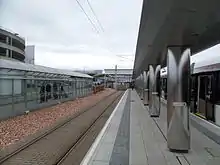 The airport has no dedicated railway station. However, it is served by the nearby Edinburgh Gateway station, which serves as an interchange with Edinburgh Trams services to the airport.[46] The tram line also connects the airport to the nearby Edinburgh Park railway station.[47]