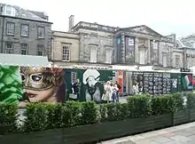 For many years, the Fringe Club (variously in the High Street from 1971 and at Teviot Row House from 1981) provided nightly showcases of Fringe fare to allow audiences to sample shows. In its earlier years the club also provided a significant space for after-hours socialising at a time when Edinburgh's strict licensing laws meant a 10pm pub closing time. For a time, the main ticket office was in the University Chaplaincy Centre, and then in the Royal Mile Centre on the High Street.[29] Although the Fringe was now associated with the High Street, areas like the New Town, West End and Morningside were also prominent in this period.[33]