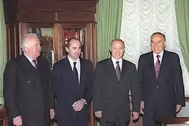 When Chernenko died, Shevardnadze became a strong supporter of Mikhail Gorbachev's leadership candidature.[30] Shevardnadze became a member of the Central Committee (CC) of the CPSU in 1976, and in 1978 was promoted to the rank of non-voting candidate member of the Soviet Political Bureau (Politburo).[31] His chance came in 1985, when the veteran Soviet Minister of Foreign Affairs Andrei Gromyko left that post for the largely ceremonial position of Chairman of the Presidium of the Supreme Soviet of the Soviet Union (official head of state). The de facto leader, Communist Party general secretary Mikhail Gorbachev, appointed Shevardnadze to replace Gromyko as Minister of Foreign Affairs, thus consolidating Gorbachev's circle of relatively young reformers.[6]