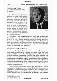 Eduard Ambrosis dze Shevardnadze (Georgian: ედუარდ ამბროსის ძე შევარდნაძე, romanized: Eduard Ambrosis dze Shevardnadze; 25 January 1928 – 7 July 2014) was a Soviet and Georgian politician and diplomat who governed Georgia for several non-consecutive periods from 1972 until his resignation in 2003 and also served as the final Soviet Minister of Foreign Affairs from 1985 to 1990.