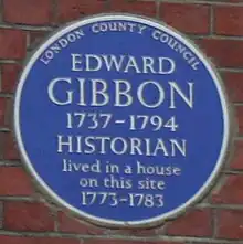 After he tended to his father's estate—which was by no means in good condition— quite enough remained for Gibbon to settle fashionably in London at 7 Bentinck Street, free of financial concern. By February 1773, he was writing in earnest, but not without the occasional self-imposed distraction. He took to London society quite easily, joined the better social clubs, including Dr. Johnson's Literary Club, and looked in from time to time on his friend Holroyd in Sussex. He succeeded Oliver Goldsmith at the Royal Academy as 'professor in ancient history' (honorary but prestigious). In late 1774, he was initiated as a Freemason of the Premier Grand Lodge of England.[25]