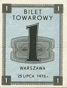 Ordered by Brezhnev not to attempt any further manipulations with prices, Gierek and his government undertook other measures to rescue the market destabilized in the summer of 1976. In August, sugar "merchandise coupons" were introduced to ration the product. The politics of "dynamic development" was over, as evidenced by such ration cards, which would remain a part of Poland's daily reality until July 1989.[20]