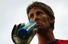 He was the first-choice goalkeeper during his first two seasons in Italy, making 66 Serie A appearances as Juventus finished runners-up in the league twice under Carlo Ancelotti, with the best defensive record in the league on each occasion.[12] He performed well in his first season, winning the 1999 UEFA Intertoto Cup, and helping the club compete for the Serie A title.[13] On the final day of the 1999–2000 season, however, Juventus lost to Perugia Calcio, after Van der Sar was beaten by Alessandro Calori's volley; the result allowed Lazio to overtake Juventus and win the league title by a single point.[14][15] The following season was less successful, however, as Juventus suffered a first-round exit in both the Coppa Italia and the Champions League, while Van der Sar committed several errors, including a high-profile one in a league fixture at home against eventual Serie A champions Roma, on 6 May 2001, when he spilled Hidetoshi Nakata's shot, allowing Vincenzo Montella to tie the game 2–2;[16][17] Juventus eventually finished two points behind the league champions.[18]