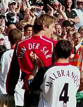 On 1 August 2001, Van der Sar opted to play in England and joined newly promoted Fulham in a shock move worth £7 million, signing a four-year contract.[20][21] The following day, Van der Sar was officially unveiled by Fulham, and upon his arrival, he described the move as a "nice friendly atmosphere" and that he felt "appreciated".[22] He made his league debut on 18 August 2001 in a 2–3 away defeat against Manchester United.[23] In total, he notched up 127 league appearances while at Fulham. In a game against Aston Villa in his final season at the club, he memorably saved two penalties from Juan Pablo Ángel in a 1–1 draw.[24] His performances for the Cottagers caught the eye of Manchester United and the attention of Sir Alex Ferguson.[25][26]