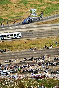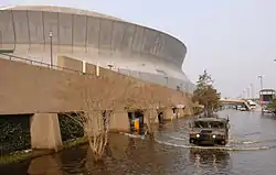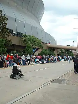 Between 80 and 90 percent of the residents of New Orleans were evacuated before the hurricane struck, testifying to some of the success of the evacuation measures.[5] Despite this, many remained in the city, mainly those who did not have access to personal vehicles or who were isolated from the dissemination of news from the local governments. The Louisiana Superdome was used to house and support some of those who were unable to evacuate. Television shots frequently focused on the Superdome as a symbol of the flooding occurring in New Orleans.