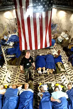 Some concern over the availability and readiness of the Louisiana National Guard to help stabilize the security situation was raised. Guardsman Lieutenant Colonel Pete had commented that "dozens of high water vehicles, humvees, refuelers, and generators were abroad."[67] At the time of the hurricane, approximately 3,000 members of the Guard were serving a tour of duty in Iraq. With total personnel strength of 11,000, this meant that 27% of the Louisiana National Guard was abroad.[68] However, both the White House and the Pentagon argued that the depletion of personnel and equipment did not impact the ability of the Guard to perform its mission—rather, impassable roads and flooded areas were the major factors impeding the Guardsmen from securing the situation in New Orleans.