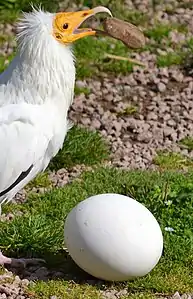 The nominate population, especially in Africa, is known for its use of stones as tools. When a large egg, such as that of an ostrich or bustard, is located, the bird walks up to it with a large pebble held in its bill and tosses the pebble by swinging the neck down over the egg. The operation is repeated until the egg cracks from the blows.[65] They prefer using rounded pebbles to jagged rocks. This behaviour, although believed to have been first reported by Jane Goodall in 1966, was actually already known to Africans and was first reported by J. G. Wood in 1877.[66][67] However, this has only been reported in Africa and has not been recorded in N. p. ginginianus.[13] Tests with both hand-reared and wild birds suggest that the behaviour is innate, not learnt by observing other birds, and elicited once they associate eggs with food and have access to pebbles.[68] Their ability to deal with ostrich eggs is utilized by brown-necked ravens which form groups that wait for the eggs to be broken before collectively mobbing the vultures and engaging in kleptoparasitism.[69] Another case of tool-use described from Bulgaria involves the use of a twig as a tool to roll up and gather strands of wool to use for lining the nest.[70]