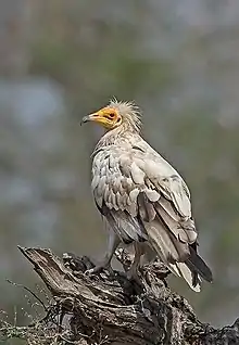 Egyptian vultures roost communally on large trees, buildings or on cliffs.[13] Roost sites are usually chosen close to a dump site or other suitable foraging area. In Spain and Morocco,[50] summer roosts are formed mainly by immature birds. The favourite roost trees tended to be large dead pines.[51][52] The number of adults at the roost increases towards June. It is thought that breeding adults may be able to forage more efficiently by joining the roost and following others to the best feeding areas. Breeding birds that failed to raise young may also join the non-breeding birds at the roost during June.[53] Allopreening has been observed in Canarian Egyptian vultures between mated pairs of individuals as well as pairs of unrelated and same-sex individuals, particularly females.[45]