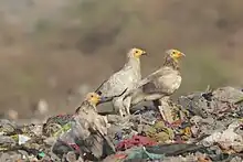 The Egyptian vulture is usually seen singly or in pairs, soaring in thermals along with other scavengers and birds of prey, or perched on the ground or atop a building. On the ground, they walk with a waddling gait.[28] They feed on a range of food, including mammal faeces (including those of humans[43]), insects in dung, carrion, vegetable matter, and sometimes small animals.[44] When it joins other vulture species at a dead animal, it tends to stay on the periphery and waits until the larger species leave.[26] Pairs may also scrounge for food from other vultures, particularly griffons. Recently fledged young will sometimes fly to other nests, competing with young vultures for food, stealing or even soliciting food from the (unrelated) adults bringing food.[45] Wild rabbits (Oryctolagus cuniculus) form a significant part of the diet of Spanish vultures.[46] In the Iberian Peninsula, landfills are an important food source, with the vultures more likely to occupy territories close to landfill sites.[47] Studies suggest that they feed on ungulate faeces to obtain carotenoid pigments responsible for their bright yellow and orange facial skin. The ability to assimilate carotenoid pigments may serve as a reliable signal of fitness.[48]