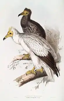 The Egyptian vulture was formally described by the Swedish naturalist Carl Linnaeus in 1758 in the tenth edition of his Systema Naturae under the binomial name Vultur percnopterus.[3] The genus Neophron was created by Jules-César Savigny in the first natural history volume of the Description de l'Égypte' (1809).[4] The genus Neophron contains only a single extant species. A few prehistoric species from the Neogene period in North America placed in the genus Neophrontops (the name meaning "looks like Neophron") are believed to have been very similar to these vultures in lifestyle, but the genetic relationships are unclear.[5][6] A fossil species Neophron lolis has been described from the late Miocene of Spain.[7] The genus Neophron is considered to represent the oldest branch of the vultures which consists of separated (or polyphyletic) clades.[8] Along with its nearest evolutionary relatives, the lammergeier (Gypaetus barbatus) and the palm-nut vulture (Gypohierax angolensis), they are sometimes placed in a separate subfamily, the Gypaetinae.[9][10]