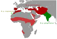 There are three widely recognised subspecies of the Egyptian vulture, although there is considerable gradation due to movement and intermixing of the populations.[11] The nominate subspecies, N. p. percnopterus, with a dark grey bill, has the largest range, occurring in southern Europe, northern Africa, the Middle East, Central Asia, and north-western India. Populations breeding in the temperate zone migrate south during winter.