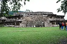 Building A has two levels, stepped frets and niches and is reminiscent of structures found in the Yucatán. However, the lower level of the building is not rooms but a solid base. The lower level is adorned with large rectangular panels which appear to have been painted red. The entrance is on the south side of the building and is quite elaborate.[45] The upper level contains a corridor that goes all the way around and a number of rooms. The upper level was adorned with stepped frets and scrolls as well. These were painted yellow, blue, red and black. The panels inside were painted with murals, of which only fragments survive. At the east and west side of the corridors are entrances to the rooms, two interconnected rooms on each side of the building.[46] Building A is constructed over older buildings that were buried when this area was filled in, some aspects of the building, like the buttresses been damage due to settling where there are no buildings below. The facade depicts a false stairway and balustrades of stepped frets capped by niches. It is unknown if the similarity between this building and the Pyramid of the Niches indicates a relationship between the two. The false stairs were originally adorned with scroll motifs done in blue and yellow paint, but very little remains. At the center of the false stairway are true stairs leading upwards under an arch to the first level of the palace.[45]