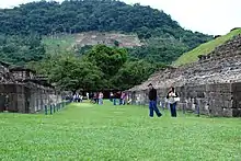 The North Ballcourt is constructed by three layers of large flagstones. There are six carved panels with ritual scenes and an ornamental frieze that runs along both walls. The court is 87 feet (27 m) long, which is considered to be unusually small and has vertical rather than sloping walls. It is probably one of the oldest structures at Tajín.[54]