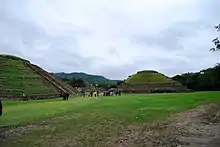 The site is located in Mexico in the highlands of the municipality of Papantla in modern-day Veracruz, not far from the city of Poza Rica, which lies northwest of the port and city of Veracruz. The city is set in the low rolling mountains that lead from the Sierra Madre Oriental to the Gulf coast near the Tecolutla River.[11] In ancient times, this city was located in the northeast corner of what is called Mesoamerica,[12] and controlled an area from between the Cazones and Tecolutla Rivers to the modern state of Puebla.[13] The main city is defined by two streams which merge to form the Tlahuanapa Arroyo, a tributary of the Tecolutla River.[12] These two streams provided the population's potable water. Most of the buildings are at the southern end, where the land is relatively flat and the two streams converge. The site extends to the northwest where terraces were constructed to place more buildings, mostly for the city's elite. However the city also had communities located on the hills east and west of the main city, with mostly lower-class dwellings.[11] Total site extends for 1,056 hectares (4.08 sq mi).[14]