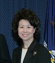 Elaine Lan Chao (born March 26, 1953) is an American businesswoman and former government official who served as United States secretary of labor in the administration of George W. Bush from 2001 to 2009 and as United States secretary of transportation in the administration of Donald Trump from 2017 to 2021. A member of the Republican Party, Chao was the first Asian Pacific American woman ever to serve in a presidential cabinet or as secretary of transportation.[3][4]