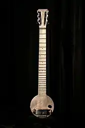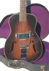 By early-mid 1935, Electro String Instrument Corporation had achieved success with the "Frying Pan", and set out to capture a new audience through its release of the Electro-Spanish Model B and the Electro-Spanish Ken Roberts, which was the first full 25-inch scale electric guitar ever produced.[14][9][10][11][12] The Electro-Spanish Ken Roberts was revolutionary for its time, providing players a full 25-inch scale, with easy access to 17 frets free of the body.[15] Unlike other lap-steel electrified instruments produced during the time, the Electro-Spanish Ken Roberts was designed to play while standing upright with the guitar on a strap, as with acoustic guitars.[15] The Electro-Spanish Ken Roberts was also the first instrument to feature a hand-operated vibrato as a standard arrangement,[15] a device called the "Vibrola", invented by Doc Kauffman.[15] [16] It is estimated that fewer than 50 Electro-Spanish Ken Roberts were constructed between 1933 and 1937; fewer than 10 are known to survive today.[9][10][11][12]