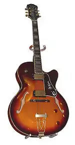 A floating or trapeze tailpiece (similar to a violin's) fastens to the body at the base of the guitar. These appear on Rickenbackers, Gretsches, Epiphones, a wide variety of archtop guitars, particularly jazz guitars, and the 1952 Gibson Les Paul.[36]